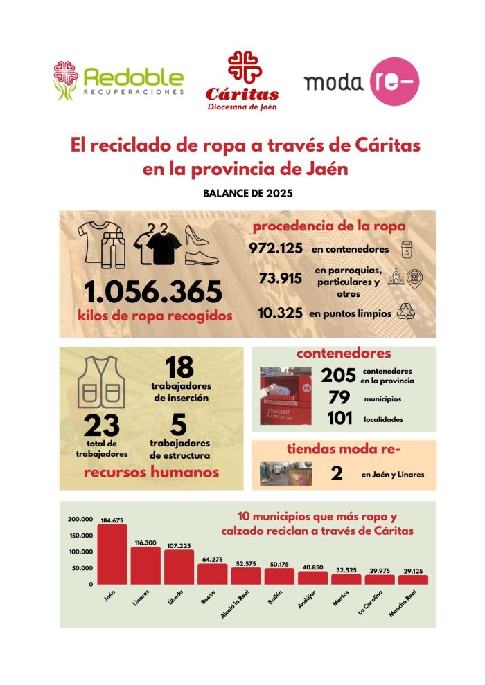 Recuperaciones Redoble forma parte de Moda re-, la cooperativa de iniciativa social impulsada por Cáritas Española. Esta estructura común permite compartir conocimiento, profesionalización, trazabilidad e innovación tecnológica en todo el territorio nacional. La labor de Recuperaciones Redoble en la gestión de residuo textil en la provincia jiennense se suma a la de otros 50 socios en diferentes zonas de España. En total, la cooperativa Moda re- ha recogido 50.925.825 kilos de ropa a través de una red de 9.172 contenedores distribuidos por todo el territorio español.