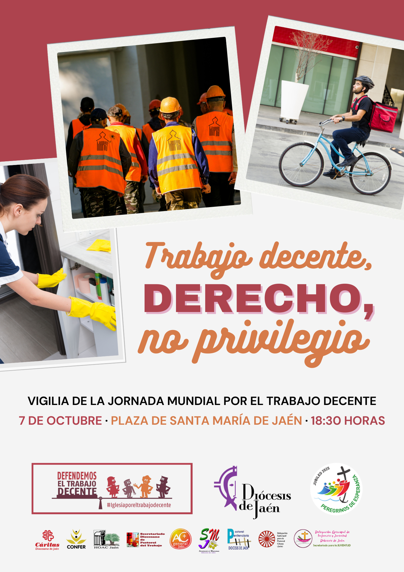 Bajo el lema “Trabajo decente, derecho, no privilegio”, las entidades promotoras de la iniciativa Iglesia por el Trabajo Decente (ITD) en Jaén celebrarán, el próximo 7 de octubre, una vigilia en la Plaza de Santa María con motivo de la celebración de la Jornada Mundial por el Trabajo Decente. Será a partir de las 18:30 horas y a través de reflexiones, testimonios y diversos gestos invitará a reivindicar que «el trabajo decente es un derecho irrenunciable, nunca un privilegio». Una vez más, se pondrá el foco en el empleo precario que aboca a «mujeres, jóvenes y personas migrantes a la pobreza». Desde la iniciativa en Jaén, se hace un llamamiento a los jiennenses a sumarse a esta reivindicación. De igual modo, según se explica, se ha remitido un guion litúrgico a las comunidades parroquiales con el fin de que se haga presente esta celebración en las eucaristías del próximo domingo 5 de octubre.
